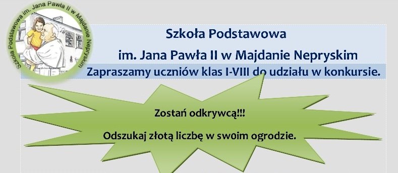 KonkursSzkoła Podstawowa im. Jana Pawła II w Majdanie Nepryskim zaprasza uczniów klas I-VIII do udziału w konkursie: Zostań odkrywcą!!! - odszukaj złotą liczbę w swoim ogrodzie.