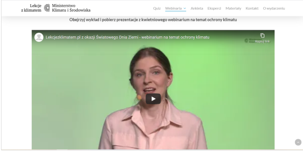 Webinarium będzie dostępne na stronie lekcjezklimatem.pl do czerwca br., tak aby każdy mógł się zapoznać z materiałem w wybranym przez siebie czasie. Mottem naszych działań niech będą słowa Arystotelesa: "Nadszedł czas, aby zrozumieć, że przyroda bez człowieka będzie istniała, ale człowiek bez przyrody nie."